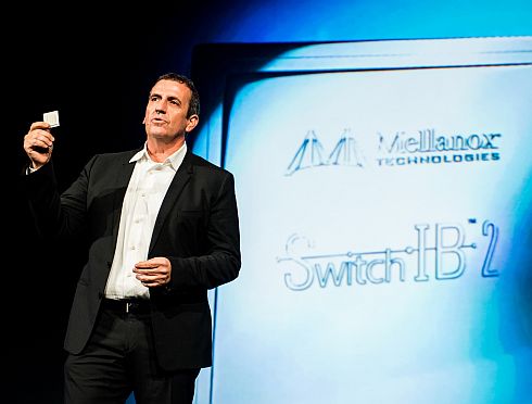 מנכ"ל מלאנוקס איל וולדמן מציג את שבב הליבה של המתג